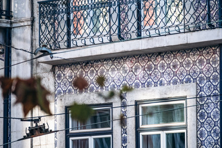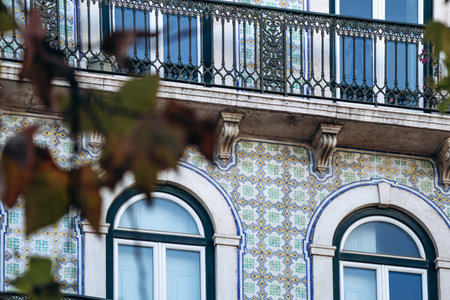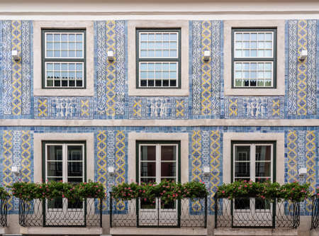 Decorative ceramic tiles on a large house with balconies in downtown Lisbon, Portugal