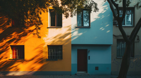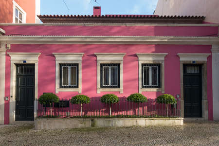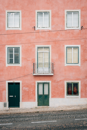 Typical building facades in Alfama district of Lisbon, Portugal, with bright colors, windows and balconies