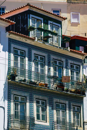 Traditional architecture of the facades covered with ceramic tiles called azulejos in the city of Lisbon in Portugal