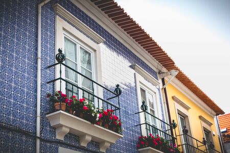 Aveiro, Portugal - May 7, 2018: Small traditional house architecture detail in the historic city center of the city on a spring day