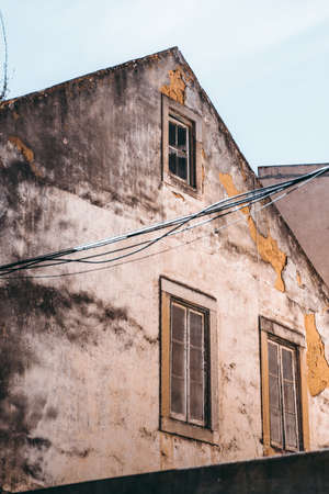 Side vertical shot of an old flaked facade of an antique residential house with a triangle roof and three windows; stretched wires in the foreground, Lisbon, Portugal