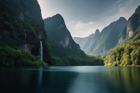 Discover a tranquil waterfall nestled in a misty forest, surrounded by majestic mountains. The calm lake reflects the serene beauty of nature, inspiring peace and relaxation.