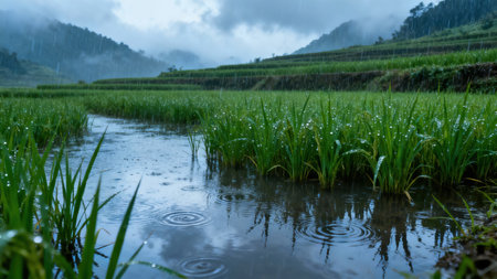 Vibrant green rice shoots growing in flooded tiered paddies, capturing the intense rainfall and resulting water ripples, with misty, dark mountain slopes visible in the distant background.
