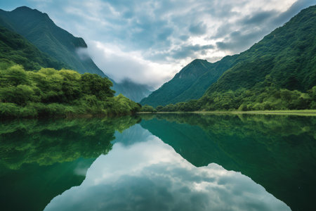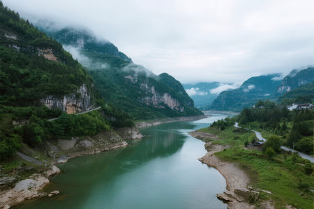 A tranquil river flows through a stunning landscape of misty mountains. A solitary boat drifts peacefully, surrounded by lush greenery and scenic beauty.