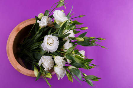 A chic bouquet of a beautiful white Japanese rose eustoma in a round wooden pot. Close up.
