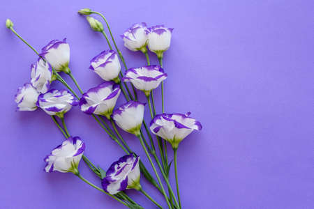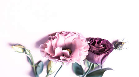 Beautiful fresh lilac and purple pink eustoma flowers on white background. Festive romantic elegant concept.