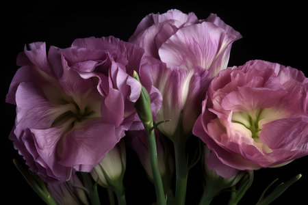 bouquet of pink and purple eustoma flowers on black background
