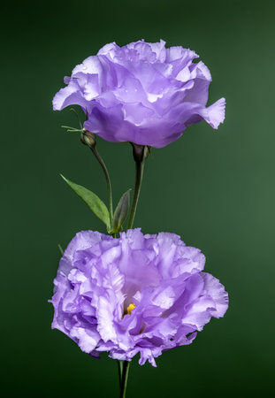 Two beautiful light purple Lisianthus flowers with delicate petals and water droplets, set against a soft, dark green background