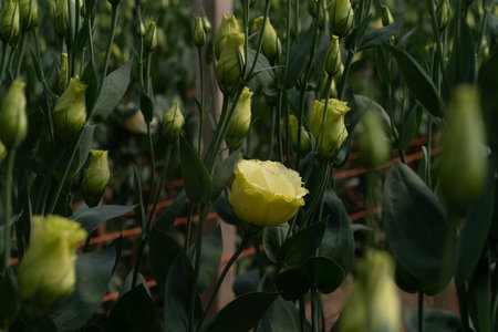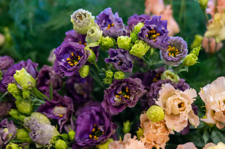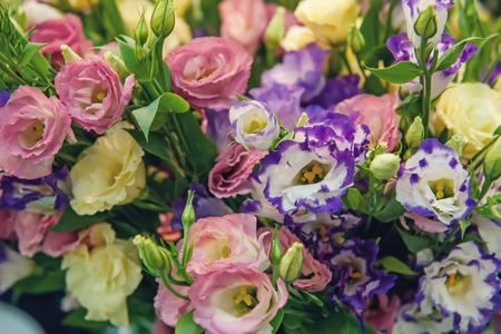 Colorful bouquet of flowers ustoma lisianthus or prairie gentian, growing in Dutch greenhouse, flora of the Netherlands, close up