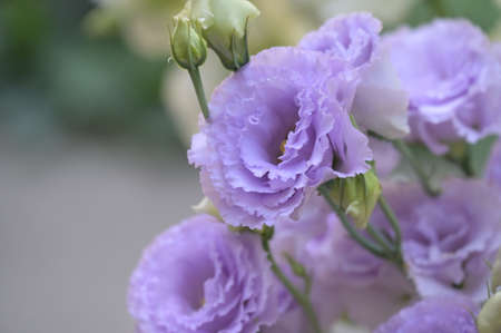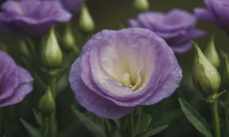 Purple eustoma flowers with dew drops on petals