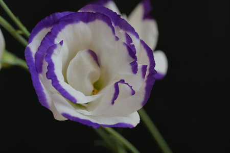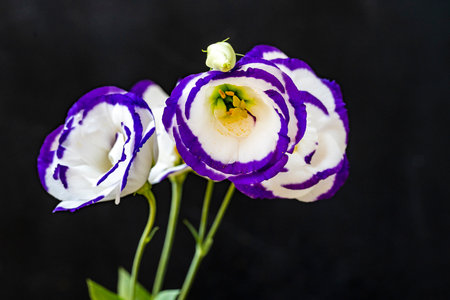 purple and white eustoma flowers isolated on black background.