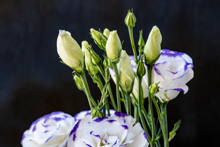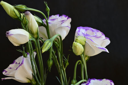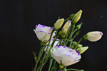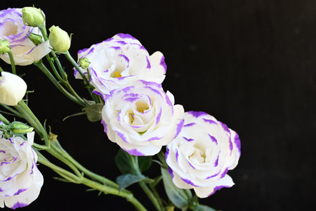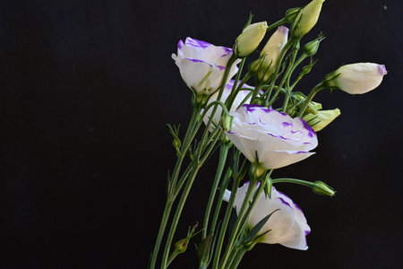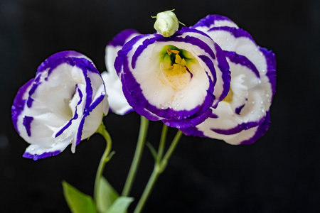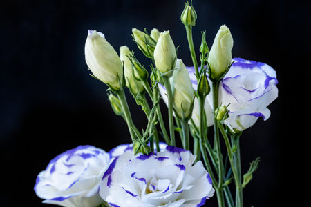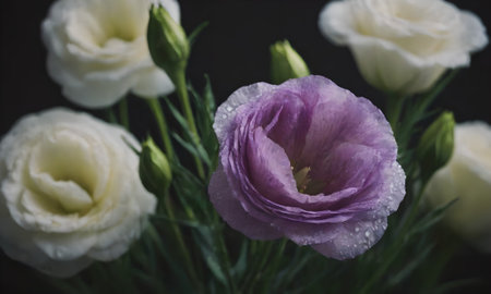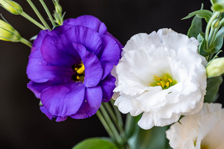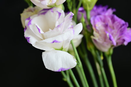 Bouquet of white and purple eustoma flowers on black background