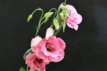 Bouquet of pink eustoma flowers on a black background