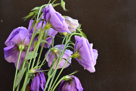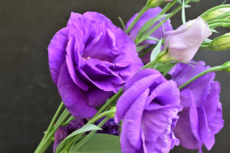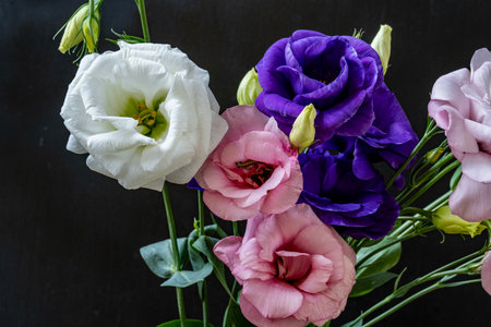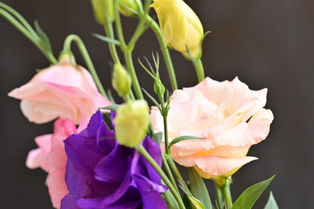 Bouquet of eustoma flowers on a dark background.
