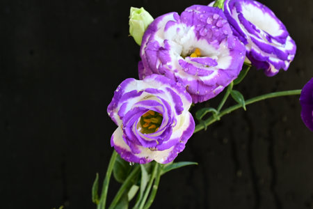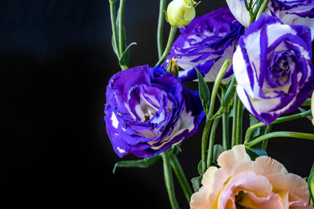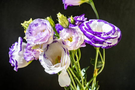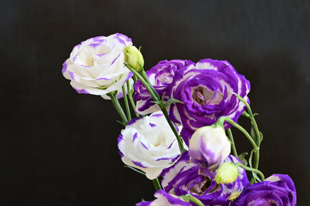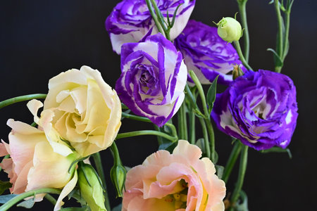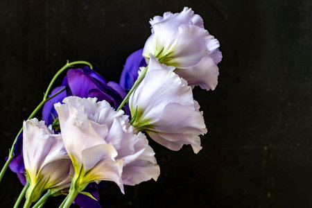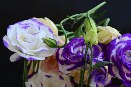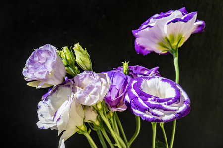Bouquet of purple and white eustoma flowers on black background