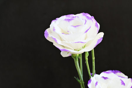 White and pink eustoma flowers on black background with copy space