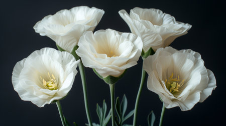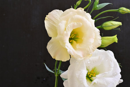 Bouquet of white eustoma flowers on a black background