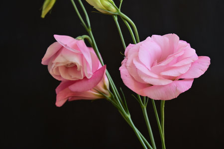 Pink eustoma flowers on a black background, close-up