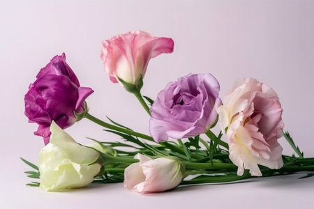 Elegant composition of white and purple eustoma flowers on a white background, arranged to emphasize their grace.