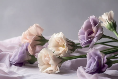 Delicate arrangement of white and purple eustoma flowers on a white background, emphasizing their soft and elegant nature.