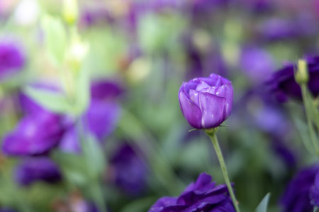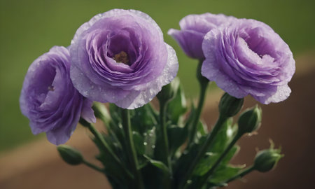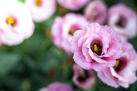 purple eustoma flowers on green background, soft focus.
