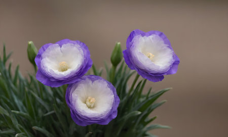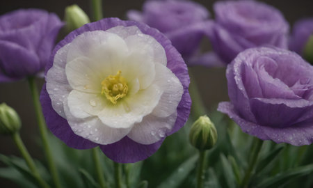 Purple and white eustoma flowers with water drops on petals