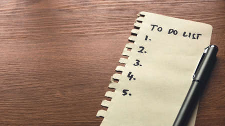 High angle view of a notepad with the to do list and a pen on grey desk