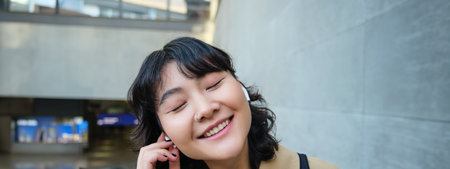 Close up portrait of smiling korean girl in headphones, listens music in wireless earphones, enjoys travelling around town with her favorite songs playlist