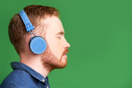 Listening to music. Caucasian handsome mans portrait on green studio background with copyspace. Male model with headphones. Concept of human emotions, facial expression, sales, ad, fashion.