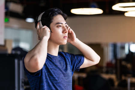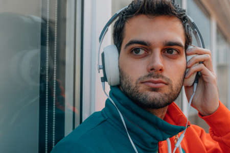 Music in his mind. Portrait of young man wearing headphones and looking away