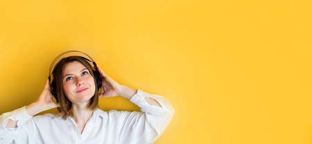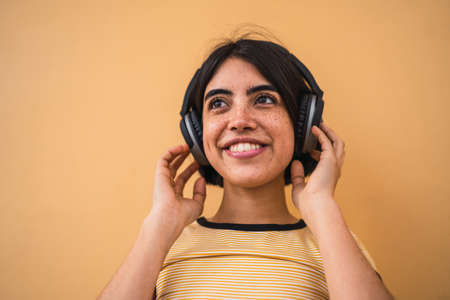 Portrait of young latin woman listening to music with headphones against yellow background. Urban concept.