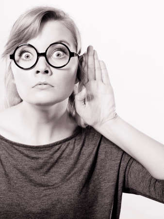 Rumors and gossips concept. Newsmonger girl making listening gesture. Shocked surprised gossiping woman. Gossip and chatter.