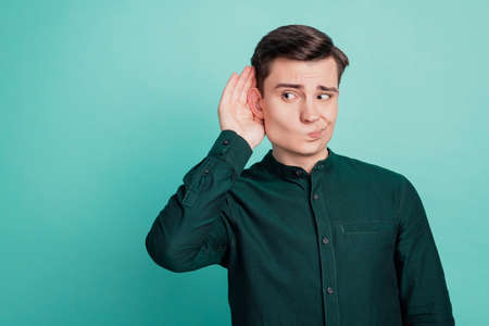 Portrait of interested guy palm ear eavesdropping doubtful face on turquoise background