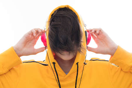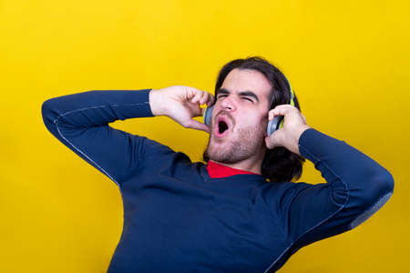 Young man listens to music with headphones. The beautiful boy dances and sings to the rhythm of the music.