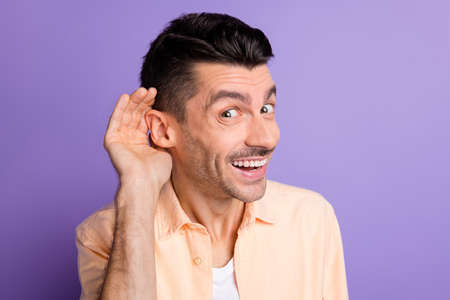 Photo of interested young guy palm ear eavesdropping listen wear beige shirt isolated violet color background