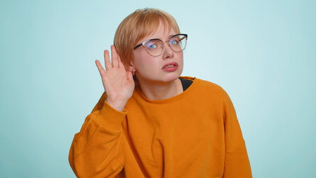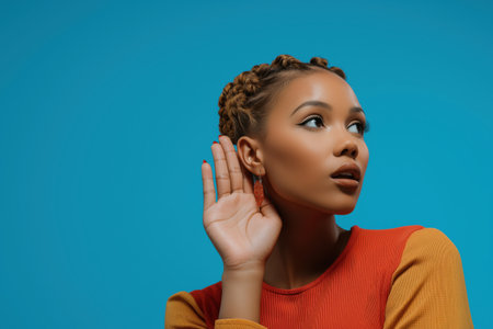 A beautiful and attractive young woman with braided hair holds her hand to her ear, trying to listen to a private conversation against a solid blue background.