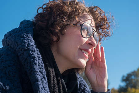Girl listens attentively with her palm to her ear close-up on a blue background.