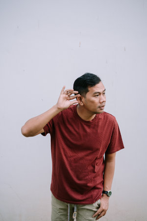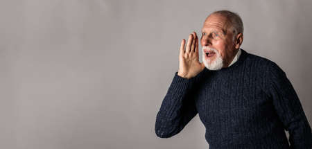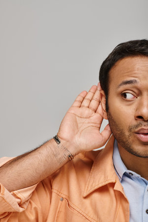 man hearing loss or hard of hearing and cupping his hand behind his ear isolate grey background, Deaf concept.