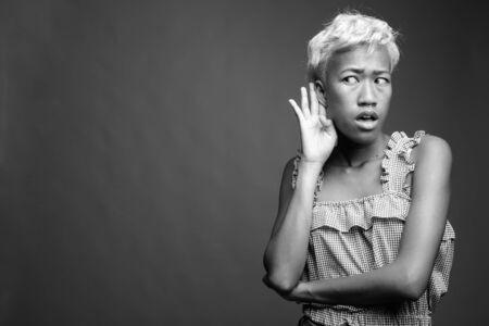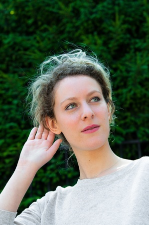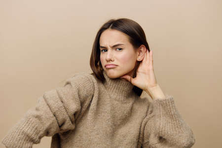 a sad, very upset woman holds her hand near her ear, listening and looking at the camera with a puzzled expression on her face. Close, Horizontal, studio photography
