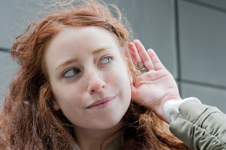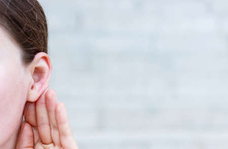 Closeup of Woman holds her hand near ear and listens carefully on grey background. Hearing problem, deaf concept.