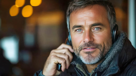 Close up side view portrait of a smiling handsome stylish mature man wearing a vest standing isolated over gray background, listening to music with earphones