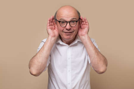 Senior bald male adult in glasses listening carefully, spying, being curious