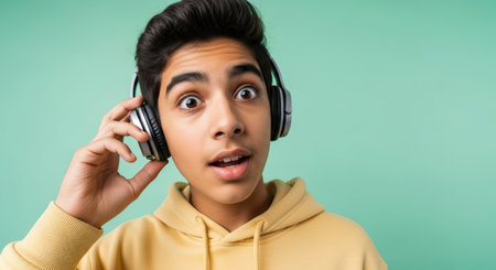 Young boy wearing headphones, showing excitement while listening to music, capturing the joy of sound and youthful expression in a lively setting