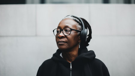 An elderly woman donning headphones and a black jacket, engrossed in her audio experience.. Generative AI