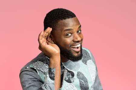 Curious interested african-american man holding hand near ear and trying to hear information, pink studio background, copy space. Excited black guy in traditional costume eavesdropping