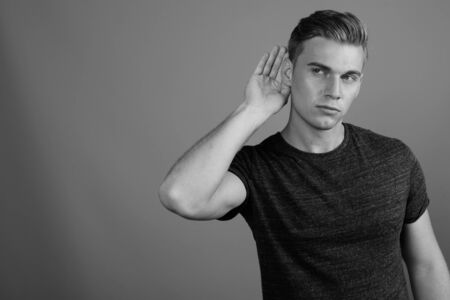 Handsome young man holds his hand near his ear, wants to hear better on a white background with a place for advertising mockup
