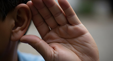 A macro shot of a man's ear with his hand cupped behind it, straining to hear a quiet sound. This shows a clear intent to listen and eavesdrop on something private.