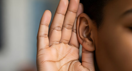 A close-up shot of a Black man's ear and face, with his hand cupped behind his ear to listen more attentively. This gesture symbolizes active listening, hearing, eavesdropping, or trying to hear a faint sound.