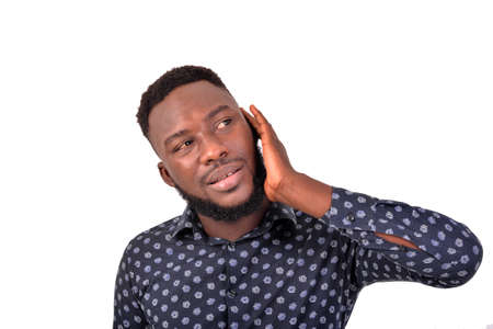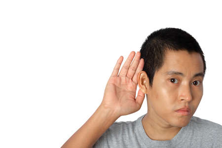 Young man hand over ear listening an hearing to rumor or gossip isolated on white background. copy space.