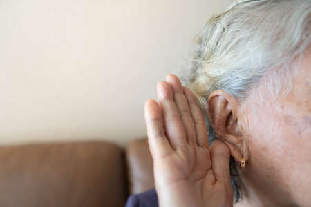 Hearing loss in seniors (Presbycusis) concept. Close up of elderly woman holding her hand near ear for trying hard to listen something. Elderly health care.